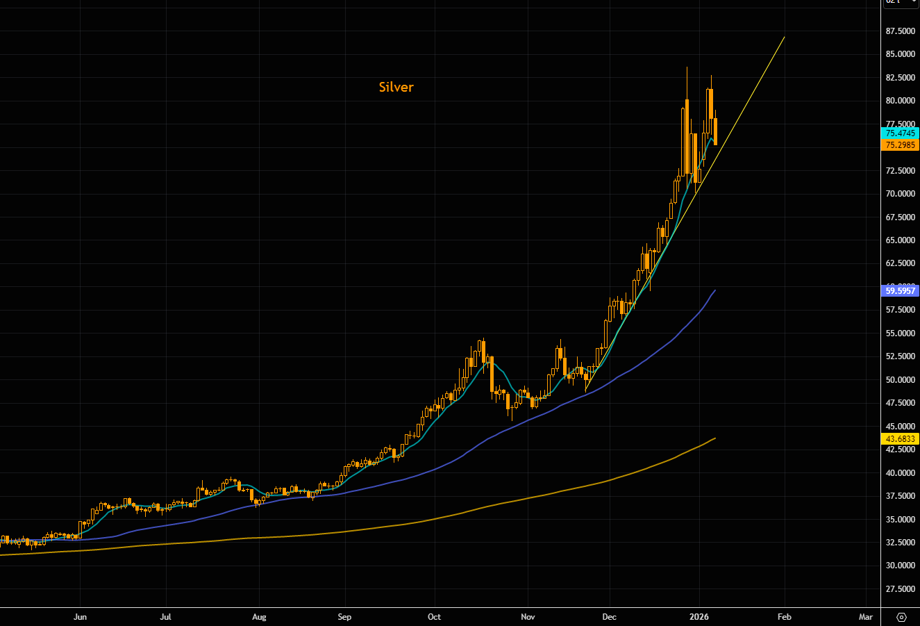 Silver is printing a second consecutive down candle, believe it or not, that hasn’t happened once since the squeeze kicked off. The steep trend line remains intact, but price is now below the 8-day moving average; we have only closed below it once since the melt-up began. Short-term make-or-break sits around $75, with the 50-day near $60 and the 200-day down at $44.