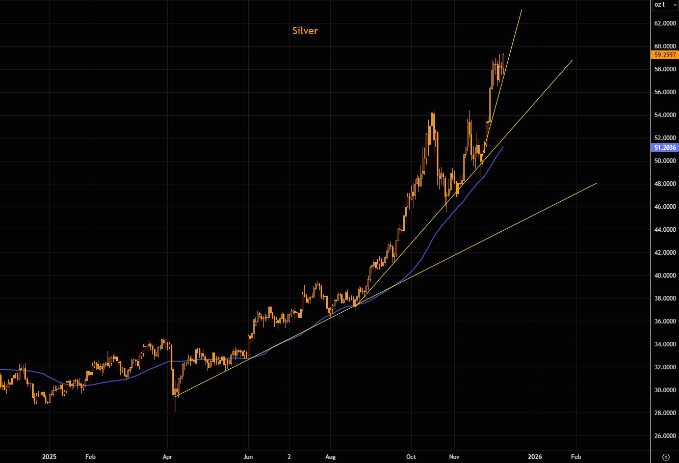 Silver is going full parabolic mode. The trend lines are getting steeper and steeper... Note how far down the 50 day is trading.
