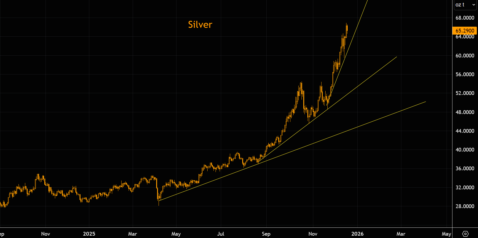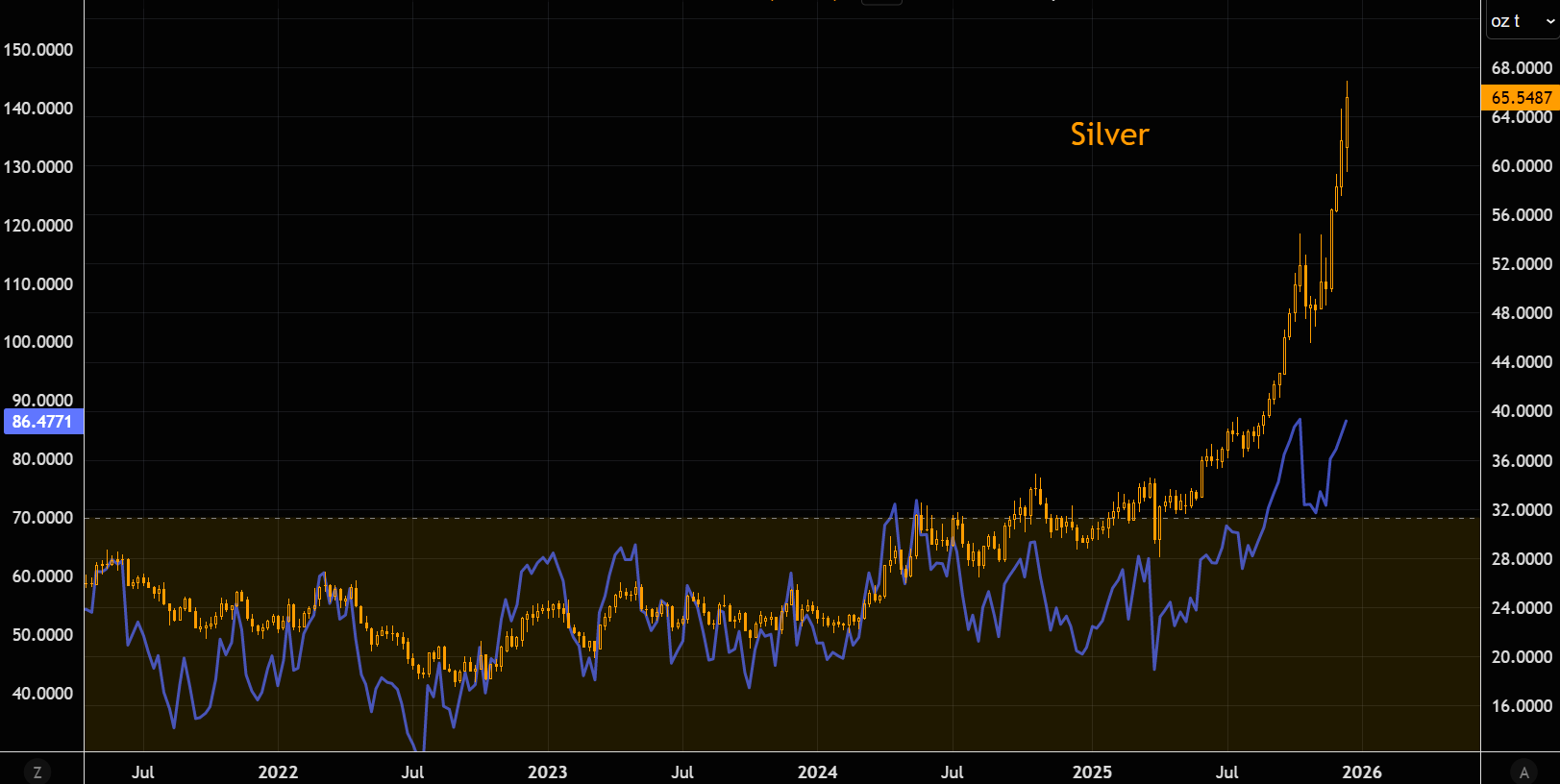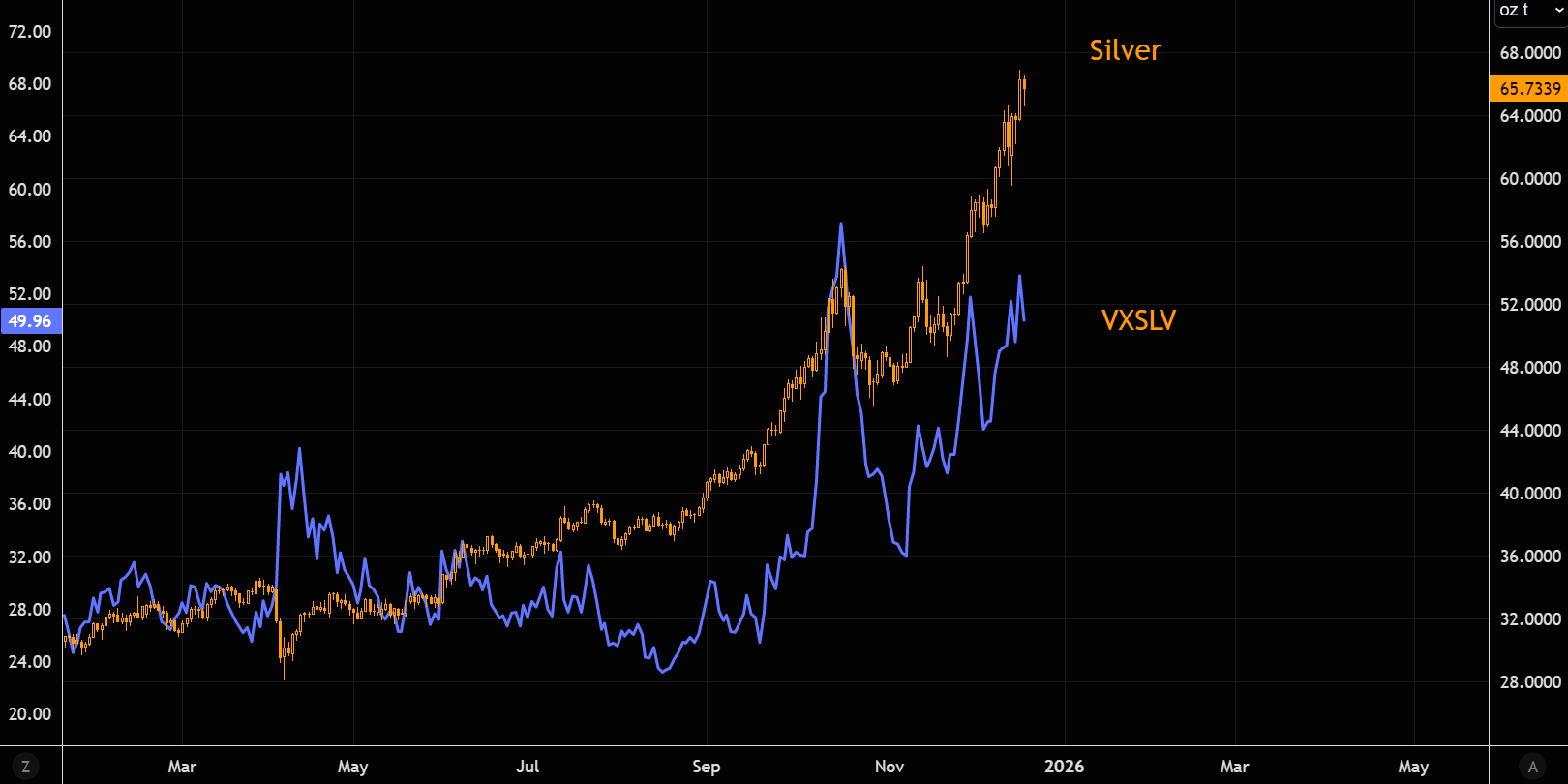 Silver volatility is back at extreme levels. These are not sustainable, and any pause or downtick in the underlying is likely to trigger volatility reset as traders monetize upside calls, risking renewed pressure on spot.