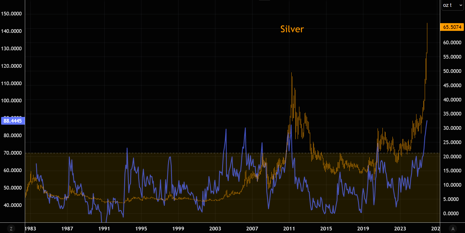 Silver’s monthly RSI is at 88, record highs, at least based on our historical price data.