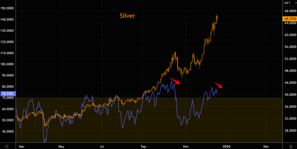 Silver weekly RSI (86!) at record highs, right at mid October "panic" levels.