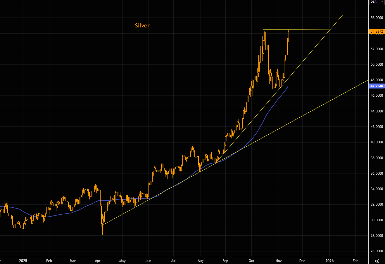 Silver bounced right off the short-term trend line just a few sessions ago and is already back at ATHs. This upside panic has actually been even bigger than the last melt-up. And once again, the 50-day sits far below.