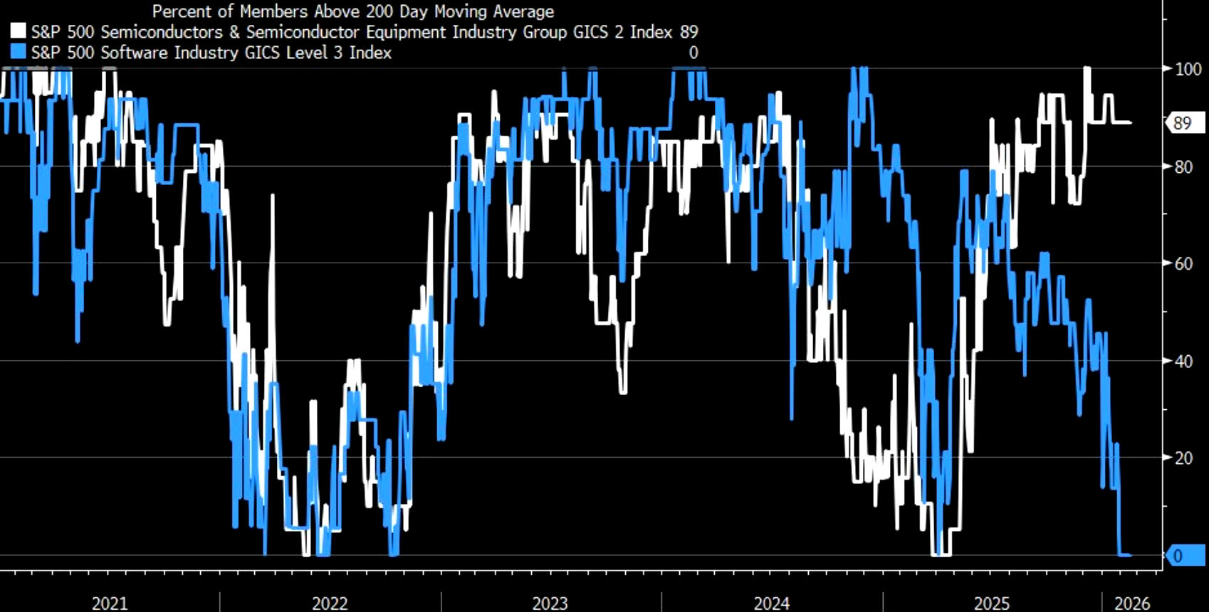 Semis: 89% above the 200-day. Software: 0%.