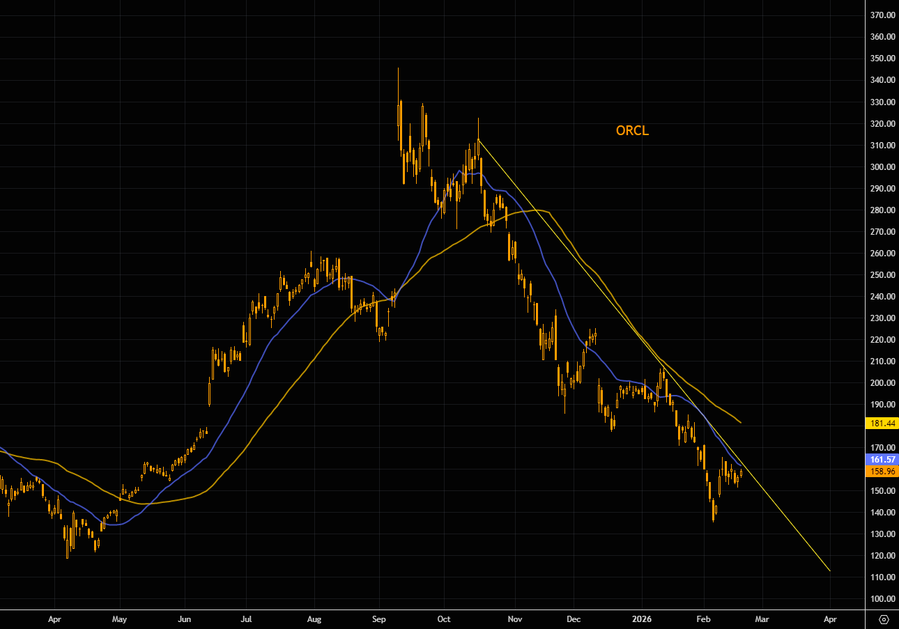 ORCL, the third-largest IGV component, is trading right on its descending trendline. The stock hasn’t reclaimed that trendline since the implosion began, nor has it been able to sustain any meaningful move above the 21-day moving average.