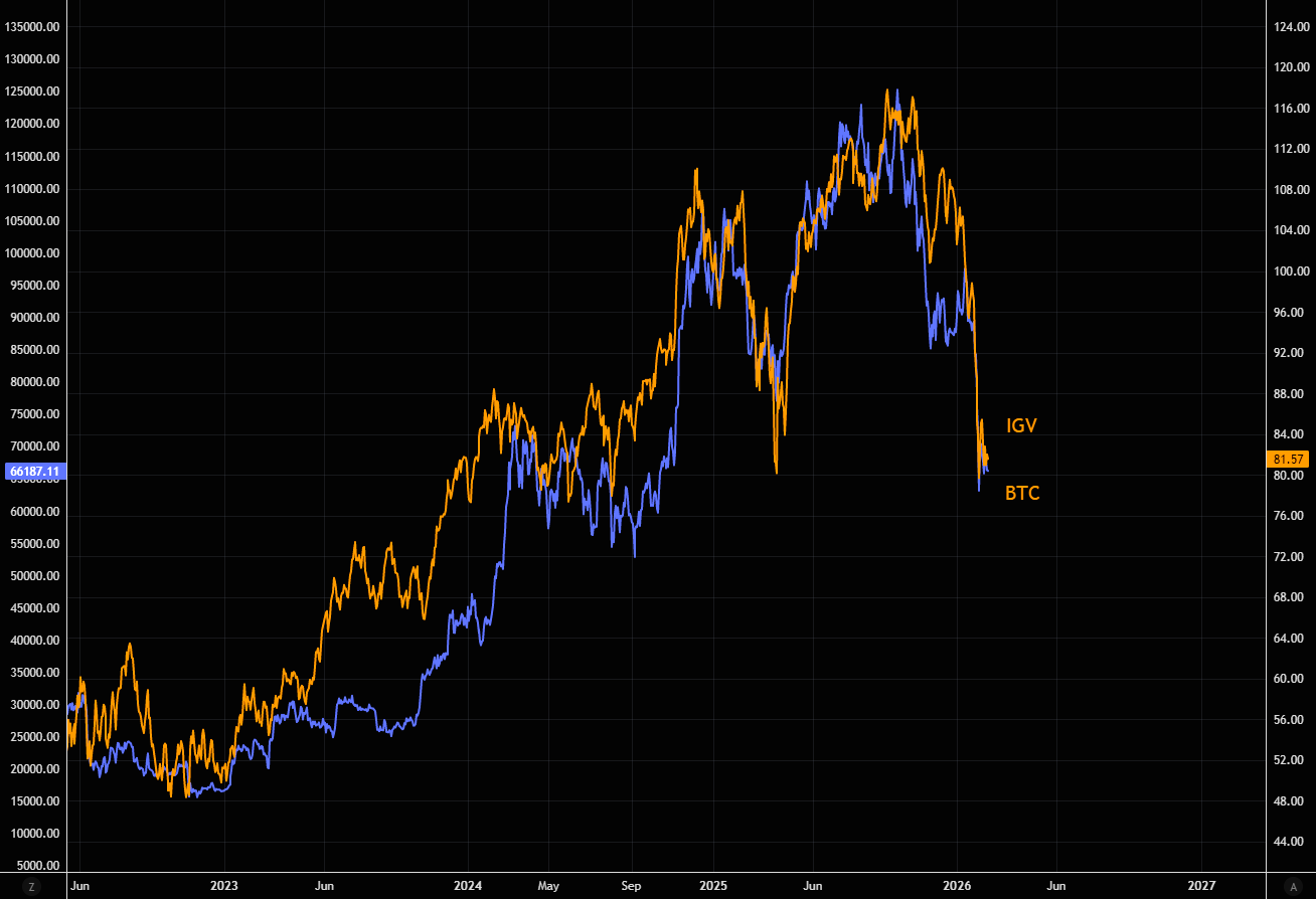 IGV and BTC continue to move in pretty much perfect tandem. Momentum in both is extremely poor.
