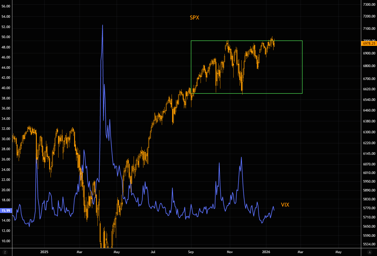 SPX remains stuck inside the range, rejecting the big 7k level today. VIX is down from recent highs, and we view volatility as attractive in using for directional bets.