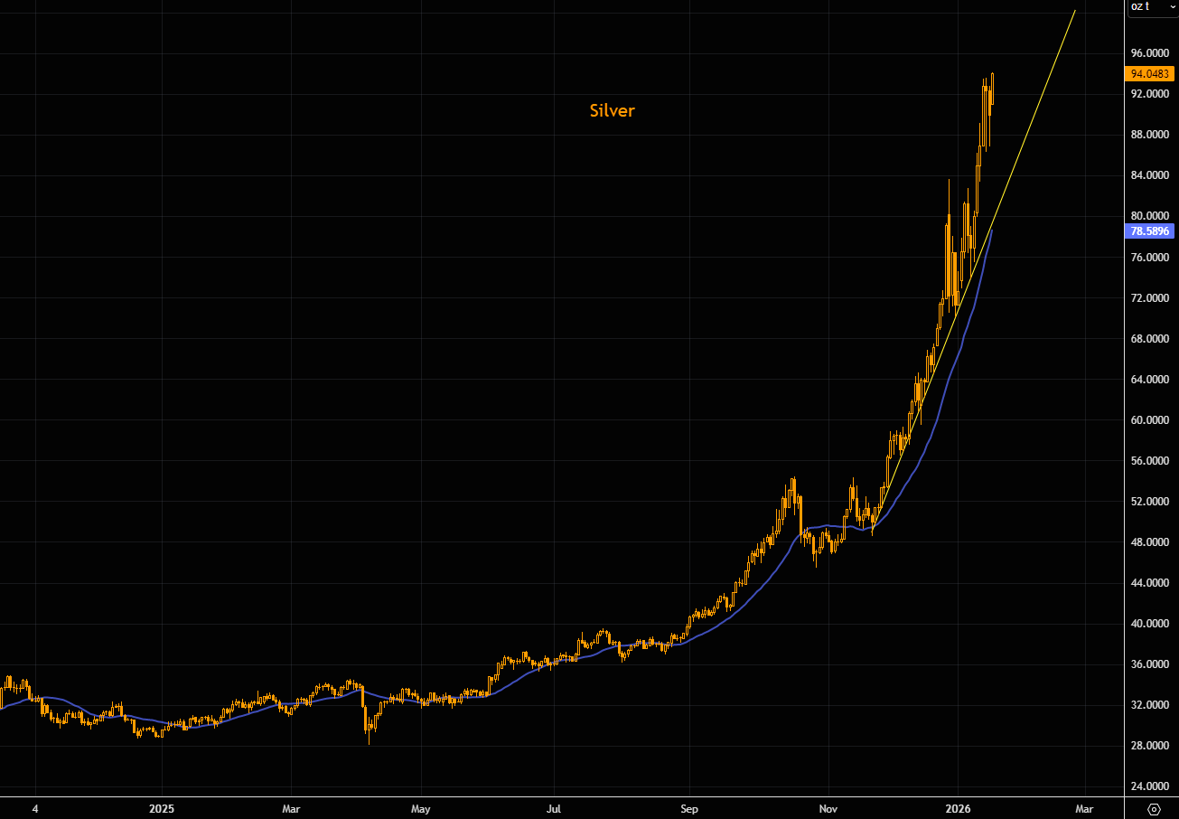 Silver pulled back for a day last week, then ripped to new ATHs. The trend is in overdrive, the 21-day far below, and momentum is extraordinary.