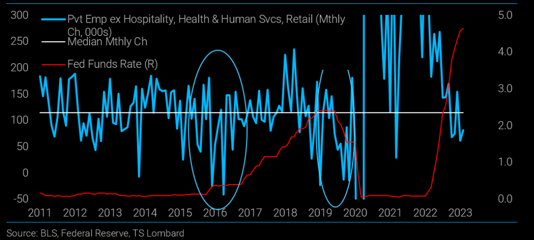 TS Lombard's Steve Blitz in his latest note basically argues that the Fed won't respond to weaker hiring: "March employment data add to the slowing momentum for hiring that the Fed has no intention of reversing. They are, instead, encouraging this slowdown and will get what they want in a few months – unemployment heading towards 4.5%". He still sees Fed funds at 3% by year end.