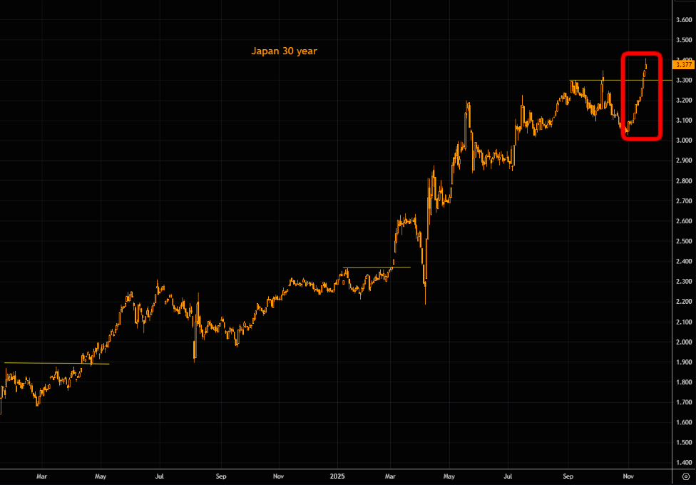 The Japanese 30 year has gone from 3% to 3.4% in no time. This has been one of the more extreme moves in the long end we have seen in a while. That break out above the magical 3.3% went too smoothly not to be nervous about what's really going on in Japan.