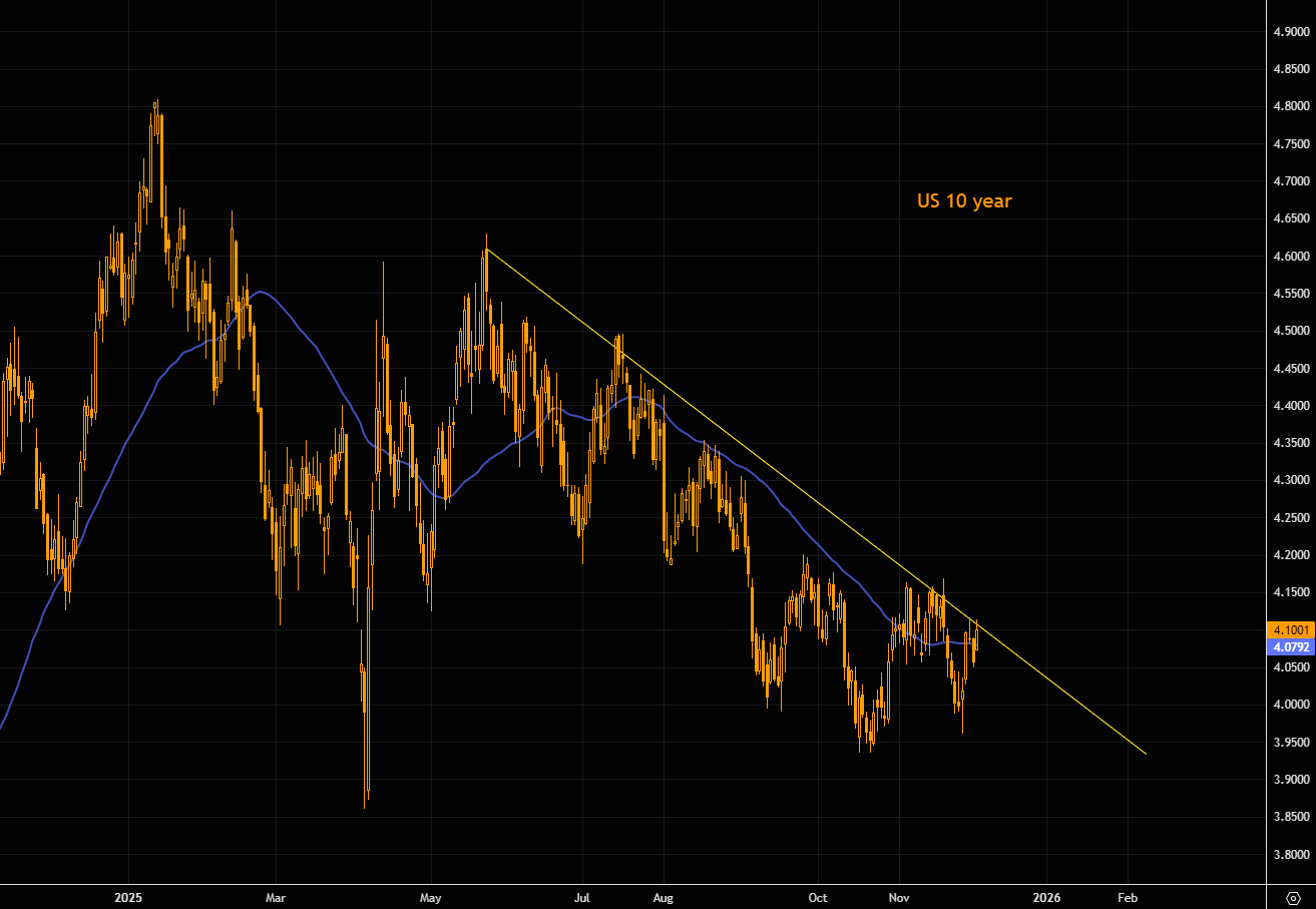 The 10 year holding "stubbornly" around that big 4.1% level. A close slightly higher and things could get a bit squeezy. Note the negative trend line from May as well as the 50 day around these levels.