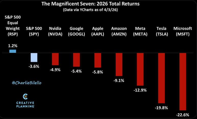 All 7 members of the Magnificent Seven are down on the year (-5% for Nvidia to -23% for Microsoft) and underperforming the average stock in the S&P 500 (which is up 1%).