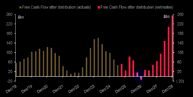 Same point as above but different chart. 2026 capex expectations have doubled, FCF negative by end of ’26. Consensus has an inflection in 2027 but it does not seem like Miss Market believes in it right now.
