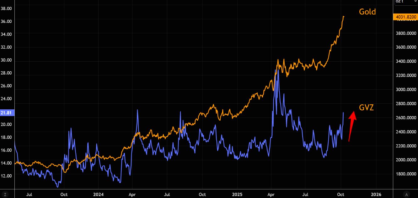 Gold volatility finally picked up. Note GVZ is at the highest levels in a while. Still far from the Liberation Day craze, but that was an extreme "event". Worth noting is that gold tends to enter a pause/correction post bigger volatility moves. The panic to buy upside calls is evident.