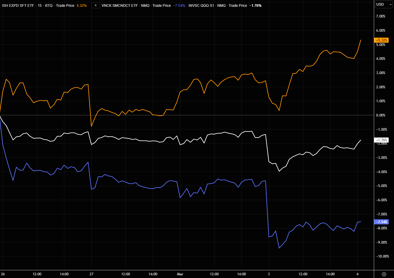 Performance over the past 5 sessions. From the top: IGV, QQQ and SMH.