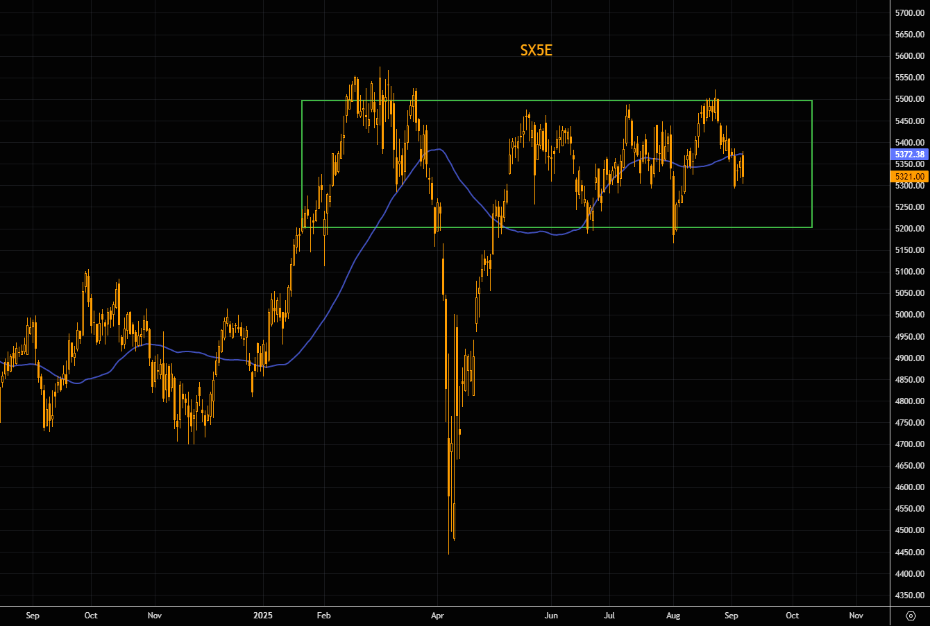 The SX5E remains trading inside the "eternal" range, dancing around the 50 day. We are basically in the middle of the range meaning that Miss Market is not showing us the way. We really don't think the French turmoil will have any major disastrous effect, but it is clear that our tactical trade will need a tight stop.