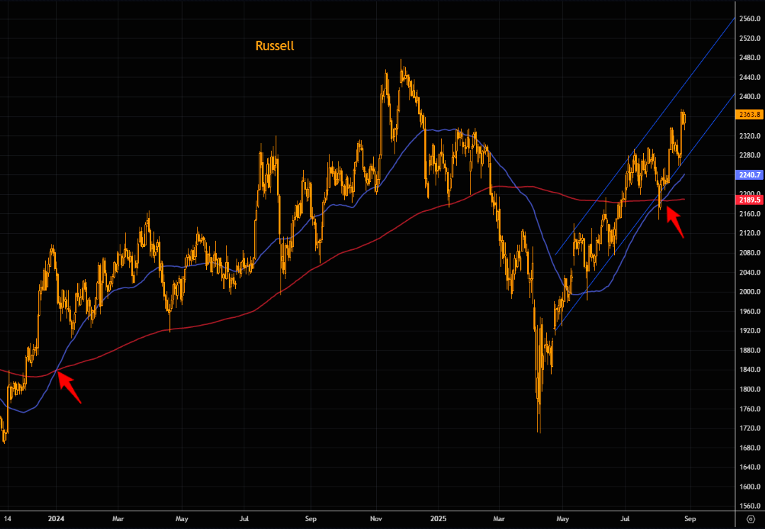 Russell trend channel very much intact as we trade close to recent highs. That is impressive given that huge up candle 2 sessions ago. The golden cross should keep bears nervous...