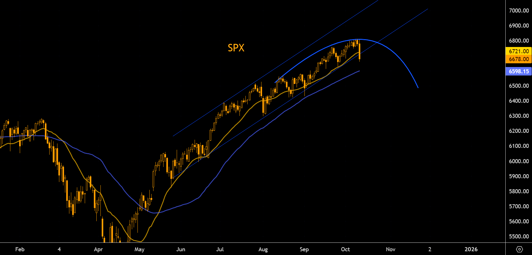 SPX trading below trend channel lows for the first time since the latest bull started. Note we are below the 21 day. 50 day comes in at 6600 (futures). We outlined the fading momentum earlier this week (more here), but first let's see how this closes today.