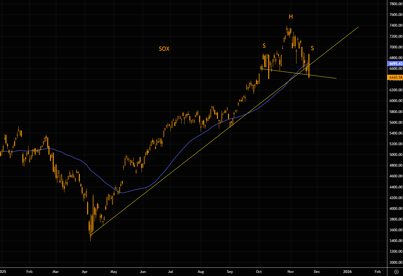 SOX breaking down below the trend line, trading "well" below the 50 day. There is also a possible HS in the making...
