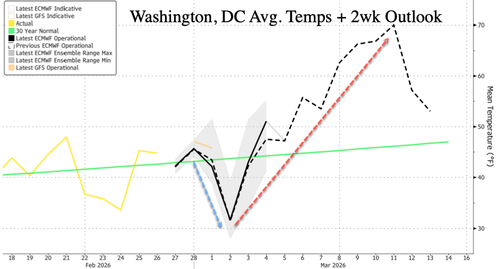 For folks in the Mid-Atlantic, this winter has been historic (see here), despite Al Gore's broken-record global-warming pitch for the last three decades, repeated at Davos earlier this year. However, warmer weather is set to return to Washington, D.C., with temperatures in the coming weeks reaching 70°F.