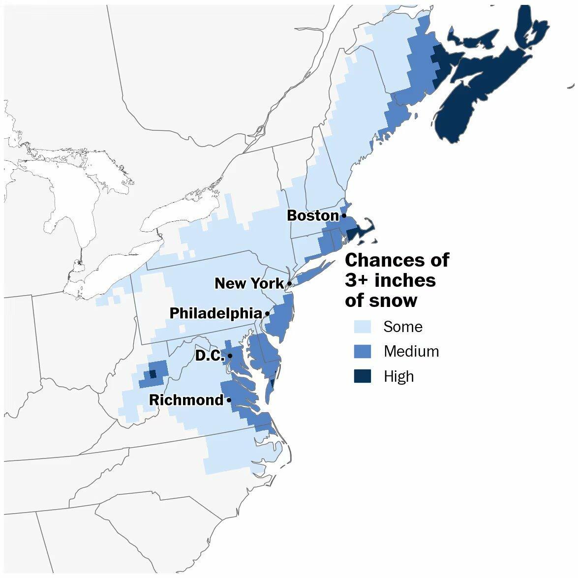 Large stretches of the Interstate 95 corridor - from Washington, D.C., to Philadelphia, to New York, and up to Boston - could be blanketed with accumulating snow. However, at this point, pinning down snowfall forecasts is too premature until confidence improves in the storm's track.