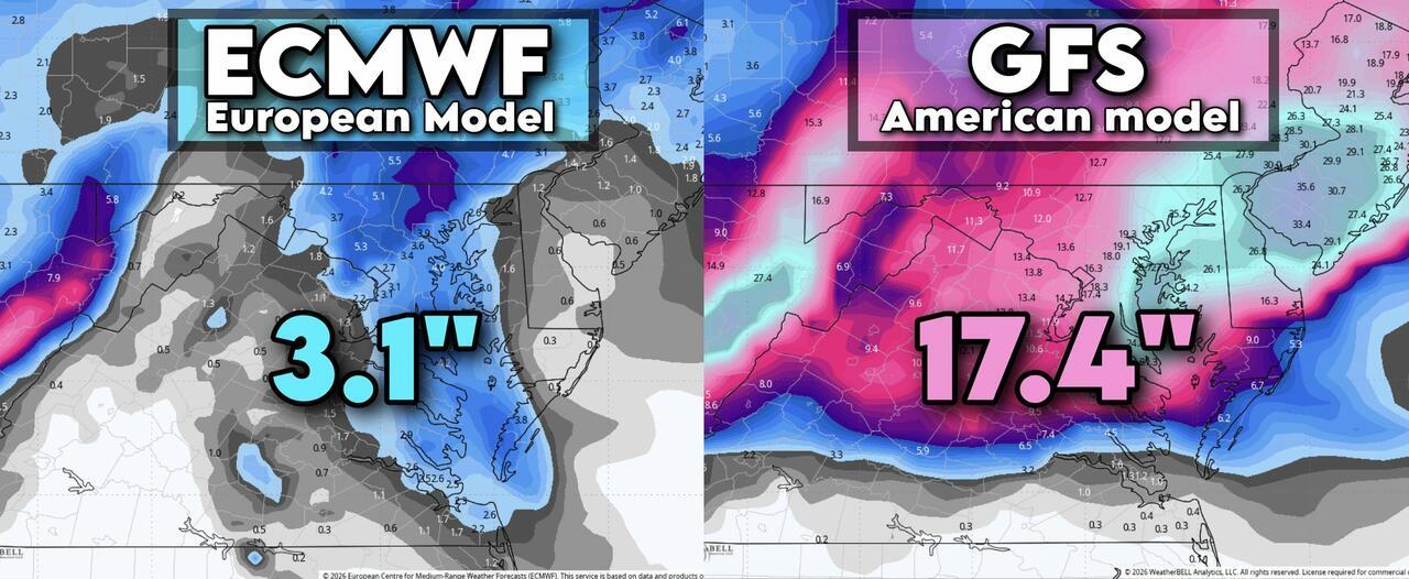 For those traveling to or from the Mid-Atlantic and Northeast this weekend, it's wise to keep an eye on which model meteorologists favor, because one scenario brings several inches, while the other shows a blockbuster winter event.