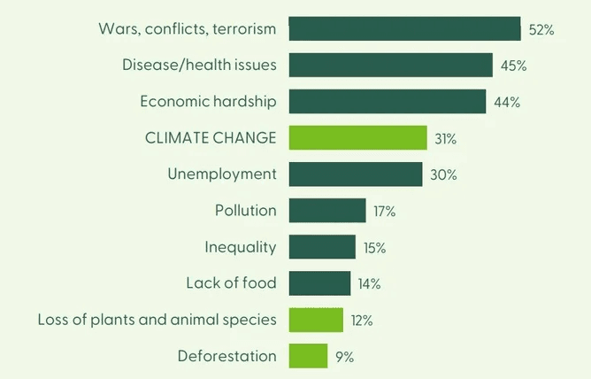 The change has been dramatic. In 2025, public concern over climate change has fallen sharply behind concerns of war and economic instability, with geopolitical turmoil and the cost of living crisis. Ipsos' 2025 Global Consumer Awareness Survey, which was published in collaboration with the Forest Stewardship Council (FSC), covers 50 countries and surveyed more than 40,000 respondents. It found that war and the economy now dominate public worries at 52%, while climate change trails at just 31%.