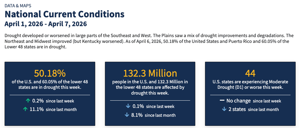 A massive drought has emerged across large swaths of the US agricultural belt, threatening crops and livestock and eventually affecting food prices, at a time when fertilizer and diesel costs are soaring. As of early April, 60% of the Lower 48 is in drought as the Northern Hemisphere growing season begins and farmers begin plantings, according to NOAA.