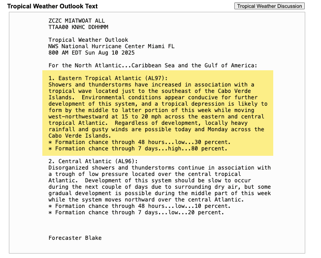 NHC gives this system a 30% chance of formation within 48 hours and an 80% chance within the next seven days.