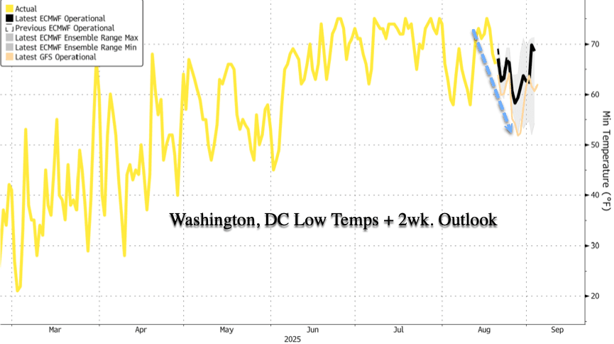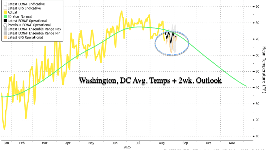 For those residing in Washington, D.C. next week, average temperatures are forecast to fall well below the 30-year seasonal norm of around 75F. Models show average temps could dip into the low 60s by late next week.