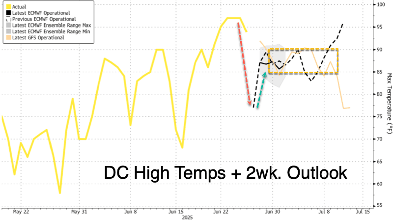 This temporary cooldown will offer relief today before temperatures climb back into the 85°F to 90°F range for the Washington metro area through the weekend.