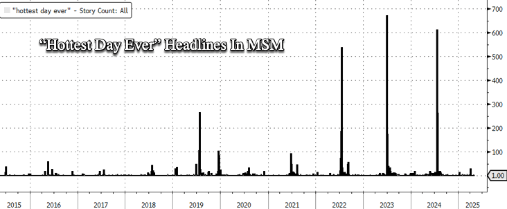 Bloomberg data shows that corporate media headlines publicizing the "hottest day ever" typically surge in June and peak during July and August, closely mirroring the height of summer in the Northern Hemisphere.
