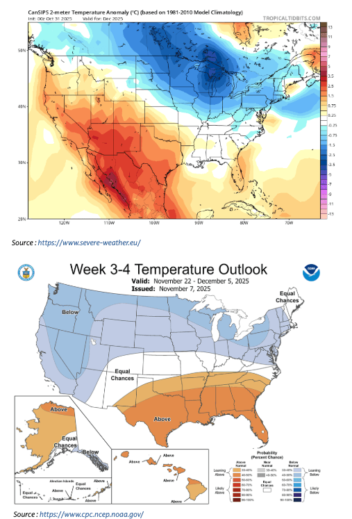 A disruption in the PV is forecast, with higher pressure building over Canada next week, we could see a Sudden Stratospheric Warming (SSW) trigger. Most SWW occur in mid to late winter, however this is early. The temperature forecast for early December indicates a potentially strong cold polar air outbreak across the northern, central, and eastern United States. Snowfall forecasts for early December also show a spread from Canada across to the north, north west and north east of the U.S. (The image below is the average long range temperature forecast). In Europe, the same snowfall pattern is being seen in the far north of the Scandis, however with the location of the low-pressure areas, the eastern side of Europe looks like a warmer anomaly. In terms of trading, Henry Hub is on its highs, the desk favour buying Dec puts as insurance if this weather does not materialise. If the cold does come, the market will need to price pulling storage harder and earlier, so front spreads should be in favour. Russell flags that if weather hits then "Z/F/G or Z/F vs H/J both look like they should carry well."