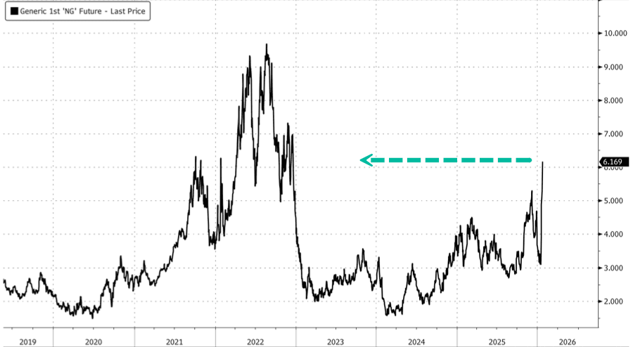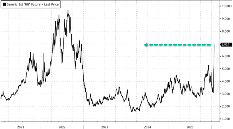 UBS analyst David Robinson told clients, "Natural gas futures have surged nearly 20% Monday Asia morning as the worst winter storm in recent years in the US has seen surging demand for heating, with plunging temperatures knocking off nearly 10% of production."