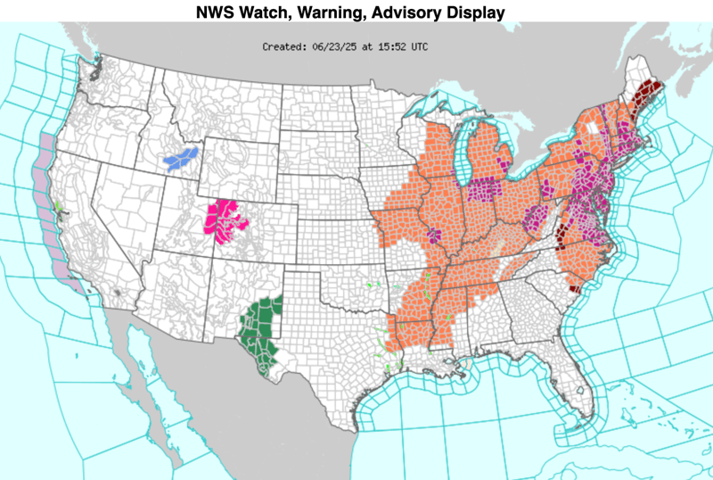 The National Weather Service has issued heat watches and warnings across much of the eastern U.S., with temperatures in the Washington–Baltimore–Philadelphia–New York City corridor expected to soar near 100°F early this week.