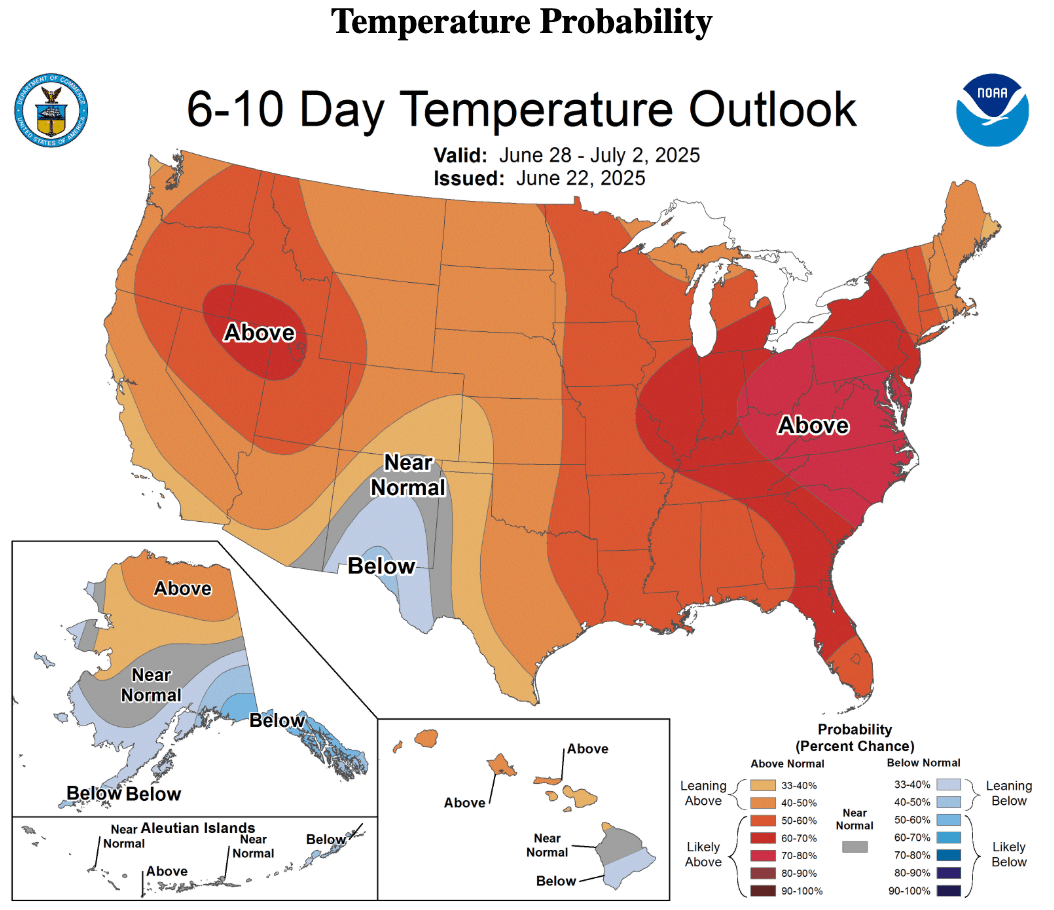 In its 6–10 day temperature outlook map, NOAA's Climate Prediction Center forecasts above-average temperatures across much of the eastern half of the U.S. through the end of the month.
