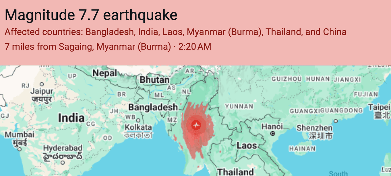 According to the U.S. Geological Survey (USGS), the quake struck near Mandalay—Myanmar’s second-largest city, home to more than a million people—around noon on Friday. A 6.4-magnitude aftershock followed just minutes later. The quakes hit at a shallow depth of about 10 miles, intensifying the surface-level destruction.