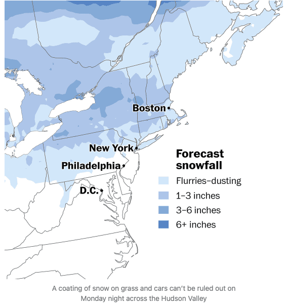 More of March's schizophrenic weather looks set to return Monday night into Tuesday, with meteorologist Ben Noll forecasting a late-season round of snow showers across parts of the Mid-Atlantic and Northeast early next week. Any meaningful accumulation is most likely at higher elevations and in the interior Northeast, while lower elevations should see lighter winter precipitation.
