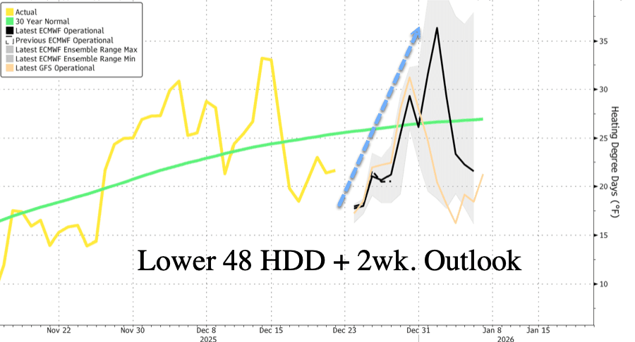Looking at Heating Degree Days for the Lower 48 - the weather-based measure of US heating demand -the index is projected to surge well above the 30-year average early next week and remain elevated through year-end.