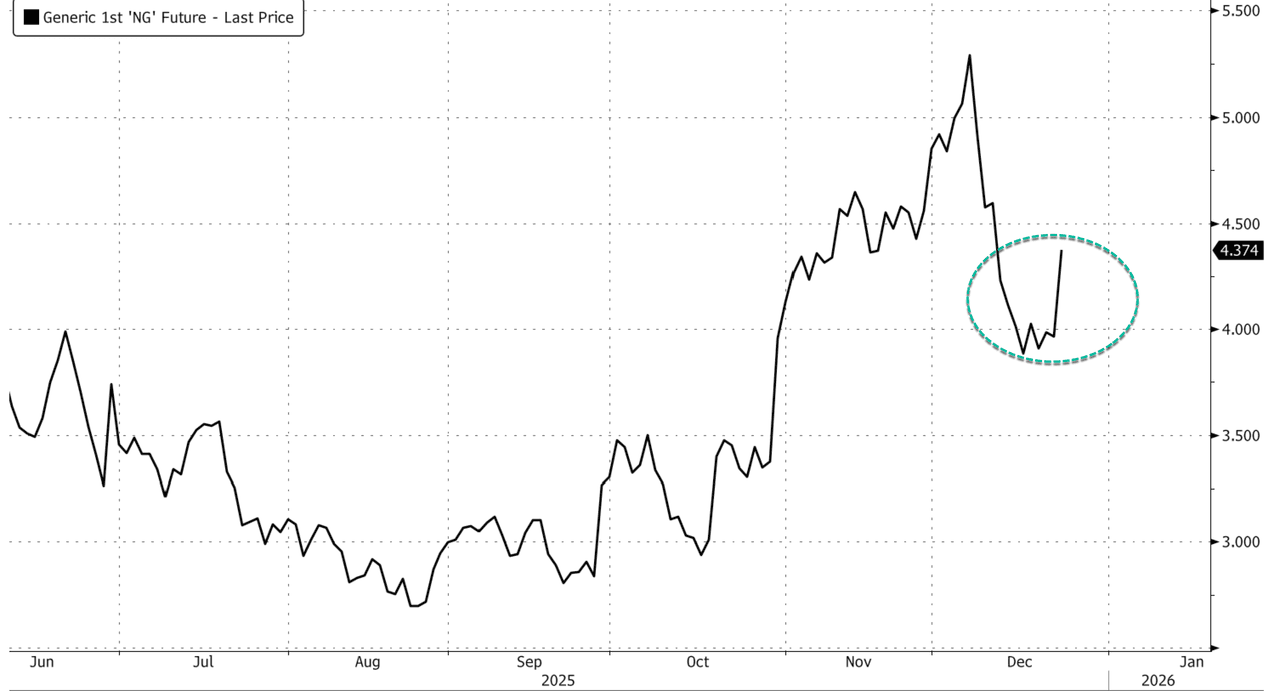 By late afternoon Tuesday, NatGas futures are up nearly 10%, the largest intraday jump since October 30's 17% price spike. Prices are trading around $4.365 per MMBtu.
