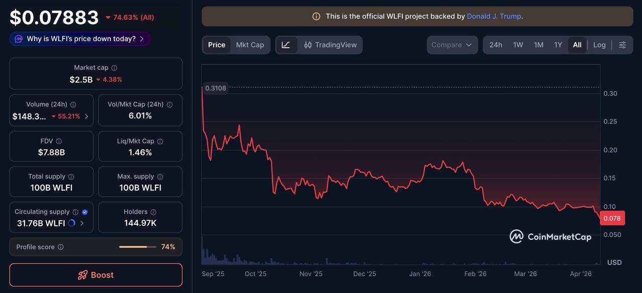 The WLFI token has crashed by nearly 75% since the all-time high reached in September 2025. Source: CoinMarketCap