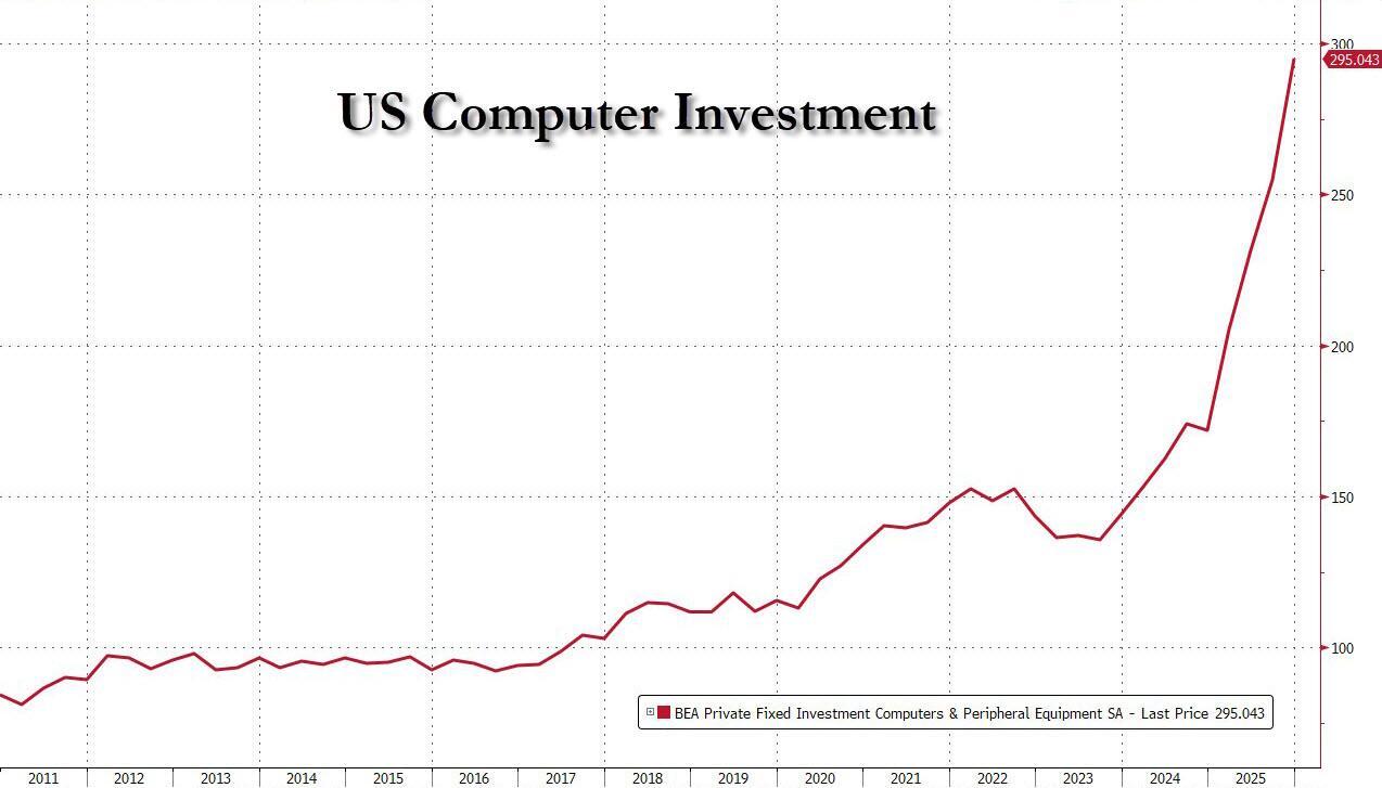 Government slowdown aside, perhaps an even more notable print is the continued explosion in spending on computers/peripheral equipment courtesy of AI, which has surged 70% in the past year and has more than doubled to $300BN at the end of 2025, more than double since the launch of chatGPT in 2022.
