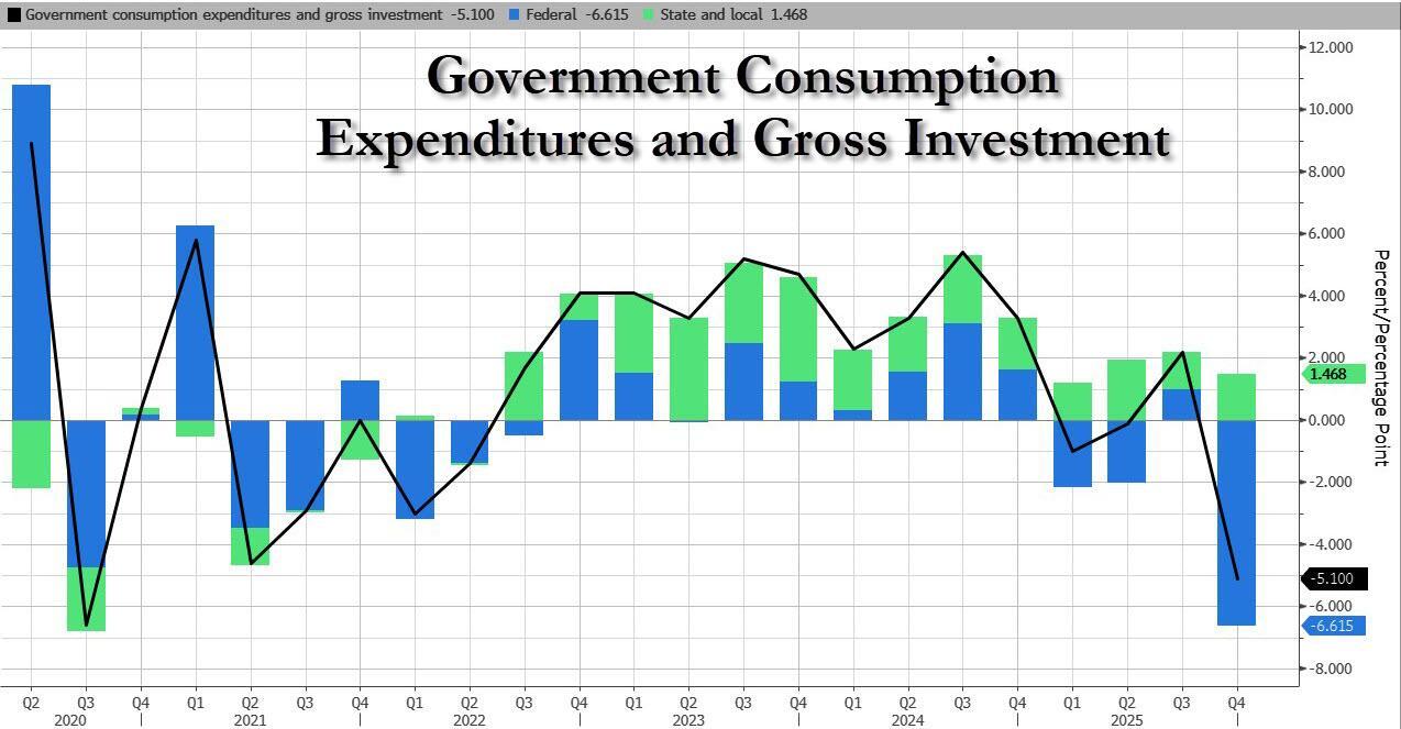 Of the above, the most notable variable was government spending, which due to the government shutdown in Q4 tumbled by 5.1% - the biggest drop since covid - and subtracted 0.9% from the final GDP number.