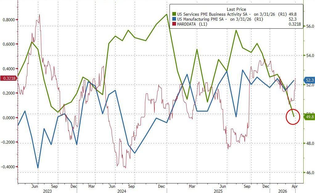 Following S&P Global's Manufacturing PMI's better than expected print higher (signaling resilience in the face of March's war in Iran), the data released this morning showed the US Services Sector experienced a contraction of activity at the end of the first quarter of 2026.