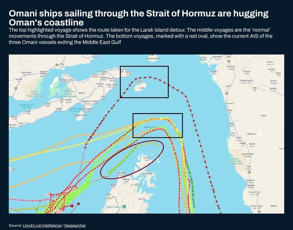 More importantly, the empty LNG tanker is not alone. According to data from Lloyd's List and Hormuz Letter, two other VLCCs, and these are laden with some 4 million barrels of Saudi and Emirati cargo unlike the empty Sohar, are sailing through the Strait of Hormuz, tracking close to the Omani coastline.