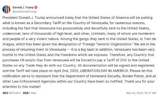 Trump cited "the fact that Venezuela has purposefully and deceitfully sent to the United States, undercover, tens of thousands of high level, and other, criminals, many of whom are murderers and people of a very violent nature," in his 25% tariff on Venezuela, and says the additional 25% tariff punishing anyone buying oil or gas will begin on April 2nd.