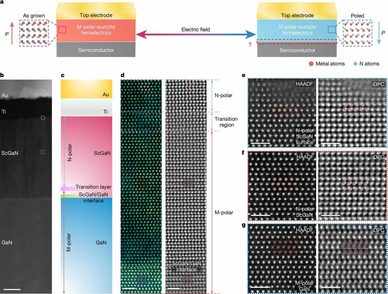 Using transmission electron microscopy and density functional theory, the team discovered that when an electric field reverses polarization, “domain walls” form at the interfaces. These walls feature a unique buckled hexagonal atomic arrangement - never observed before - where dangling bonds with negatively charged electrons precisely compensate the positive charge buildup, stabilizing the material.