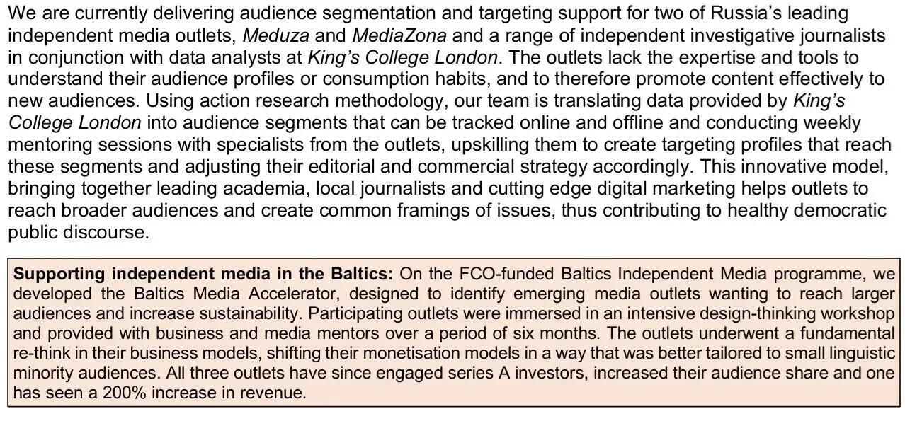 Chief among these shady groups was a psyop specialist firm called the Zinc Network. In confidential submissions to the British government, Zinc noted that it was “delivering audience segmentation and targeting support” to both Meduza and MediaZona, another supposedly independent outlet launched by US-funded anti-Putin provocateurs Pussy Riot. Zinc stated, “the outlets lack the expertise and tools to understand their audience profiles or consumption habits, and to therefore promote content effectively to new audiences.”