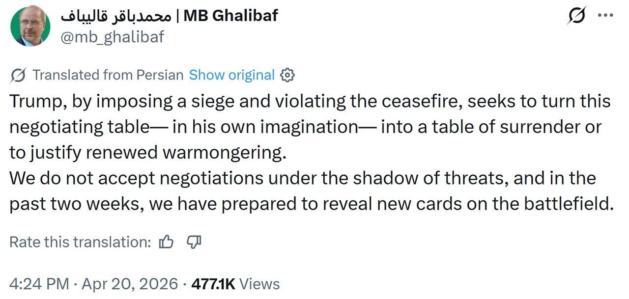 "An Iranian delegation is making plans to travel to Islamabad on Tuesday for negotiations with the United States, according to two senior Iranian officials familiar with the plans. Mohammad Bagher Ghalibaf, the influential political and military figure leading the talks," the publication writes. Latest follow-up from Ghalibaf amid continued conflicting info:
