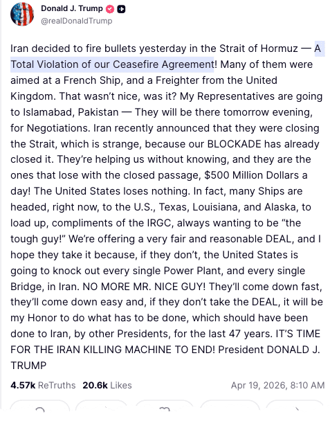 Iran decided to fire bullets yesterday in the Strait of Hormuz — A Total Violation of our Ceasefire Agreement! Many of them were aimed at a French Ship, and a Freighter from the United Kingdom. That wasn't nice, was it?