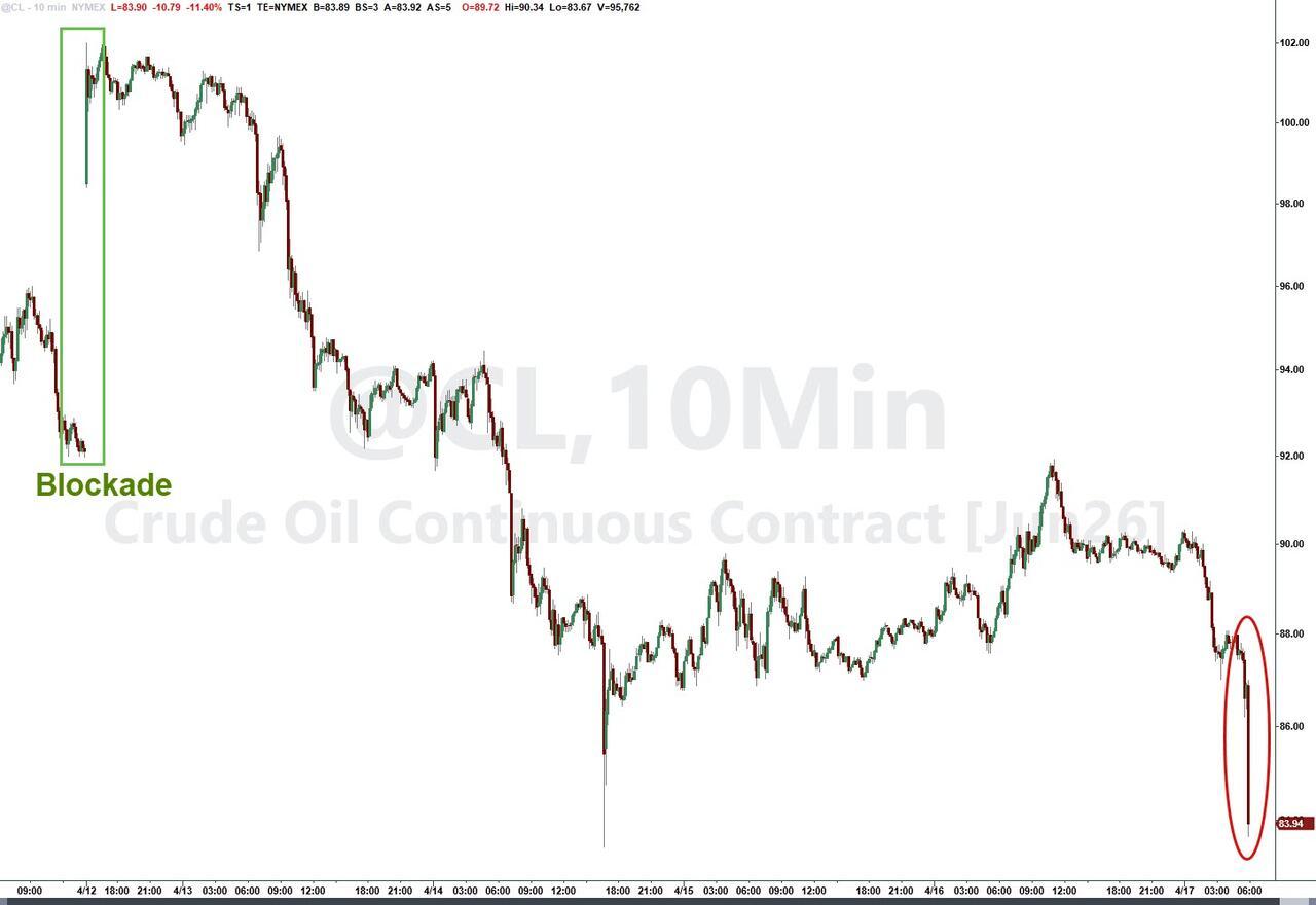 WTI Crude front-month oil futures prices are tumbling on the report, down over 11% - back near post-ceasefire lows...